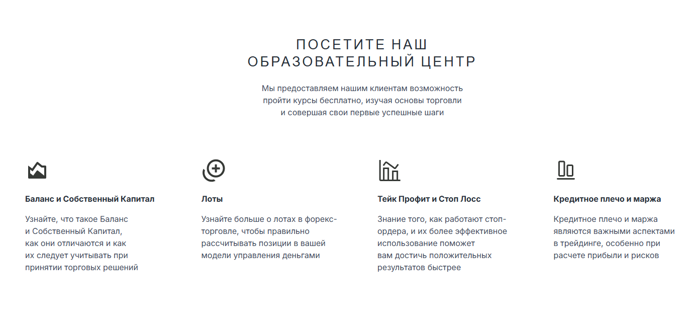 Брокер заявляет, что у него есть собственные курсы для трейдеров. Но подробности обучения и стоимость не раскрываются.