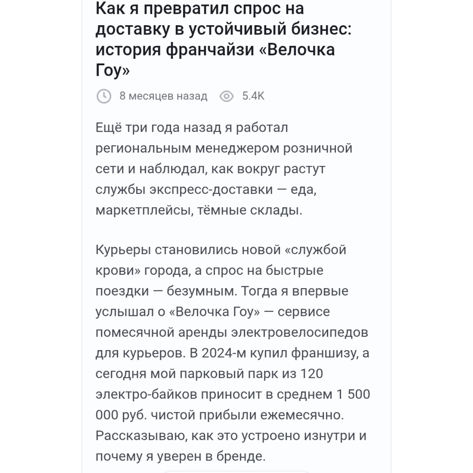 Тот случай, когда обещания и реальность расходятся как две параллельные прямые! Франшиза вообще себя не окупает, велосипеды требуют ремонта, а после оплаты обещанная поддержка куда-то исчезает! Получается мне пышными фразами втюхали дохлый проект! Видимо они поняли, что заработок на таких дураках как я приносит гораздо больше денег, чем сама аренда этого хлама(((