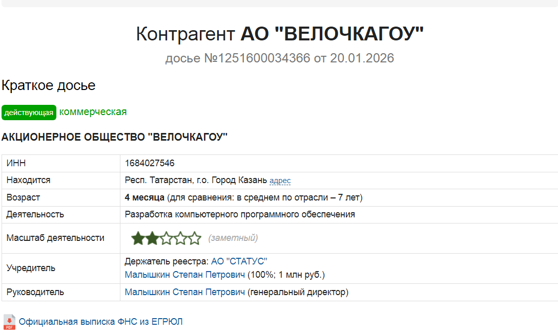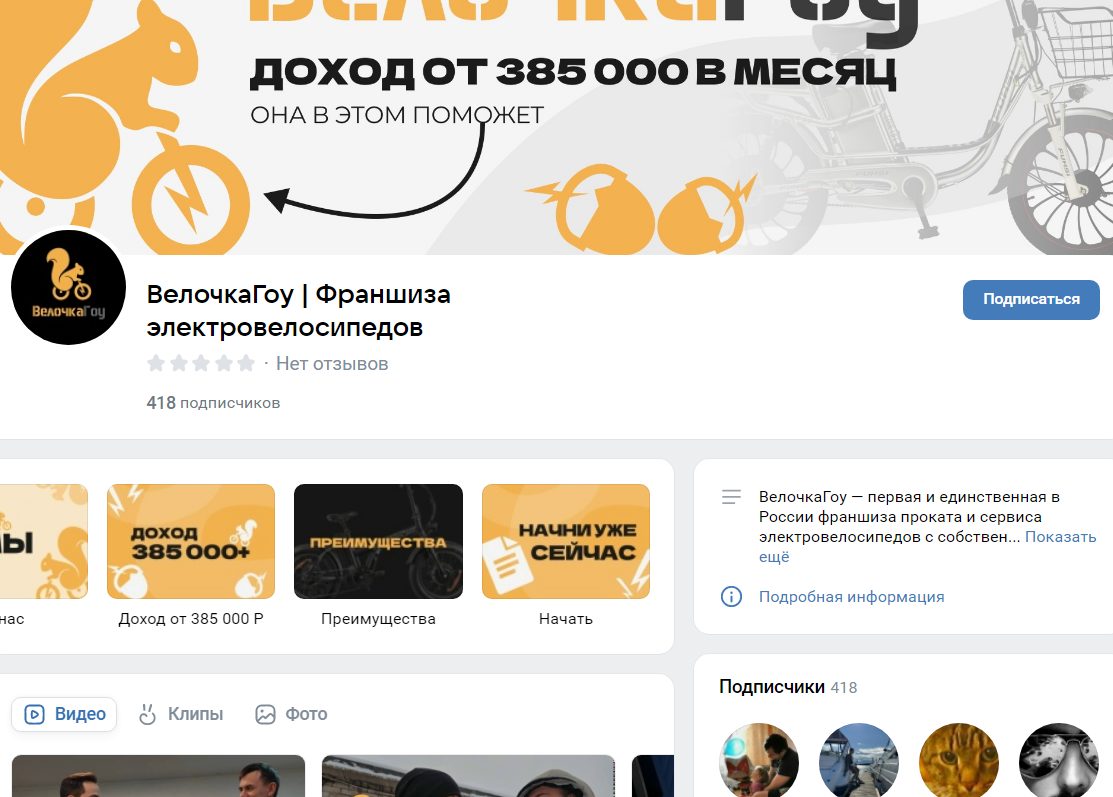 Владельцем франшизы является Степан Малышкин. На площадке оставлен номер ИНН, КПП. Организация ООО Велочка Гоу ОКВЭД зарегистрирована в Казане.