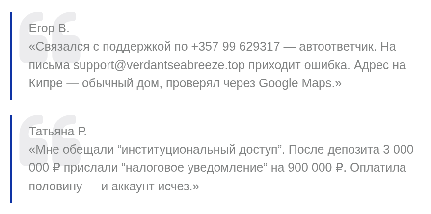 Если проанализировать реальные отзывы о verdantseabreeze top в сети, ситуация становится предельно ясной – довольных клиентов у этой конторы просто нет. Пользователи описывают примерно одинаковую схему развода: навязчивые менеджеры звонят с разных номеров, уговаривают вложить небольшую сумму (обычно около $250) для «теста», обещая золотые горы и личное сопровождение аналитика.