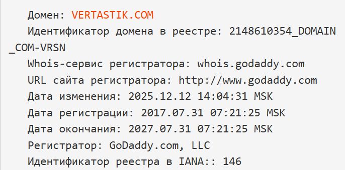 На сайте Vertastik, как и положено, дано описание компании. В нем говорится, что брокер начал работу в 2017 году, открыв несколько офисов в Европе. Проверка Whois подтвердила данную информацию.