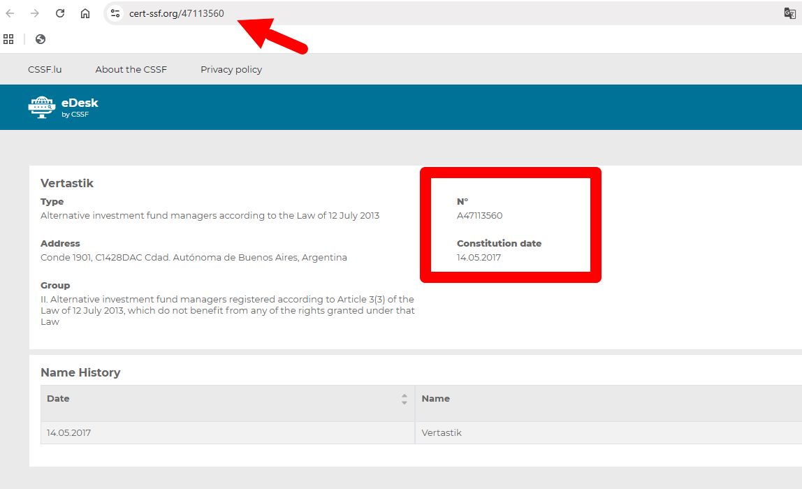 На Vertastik com рядом с наименованием представленных регуляторов указаны ссылки, ведущие на страницы с идентификационными данными брокерами. Но все страницы поддельные. Злоумышленники лишь придали интерфейсам знакомый вид оригинальных веб-ресурсов CSSF, DFSA, VFSC и FCA, но сами номера лицензий отсутствуют в базах реальных регуляторов.