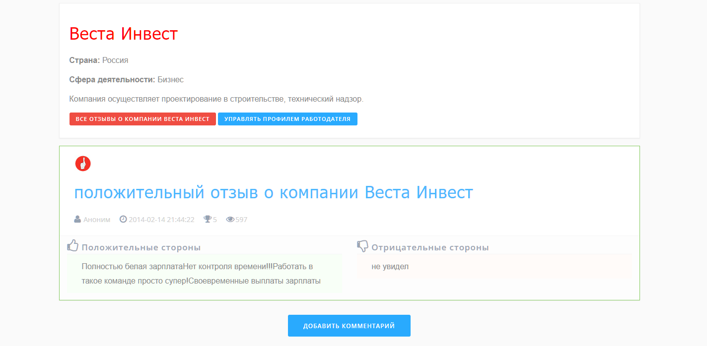 Удалось найти только один отзыв про эту организацию, но не от инвестора, а от сотрудника компании. Но на сайте отзывов указано, что фирма занимается техническим надзором в строительстве и проектированием.