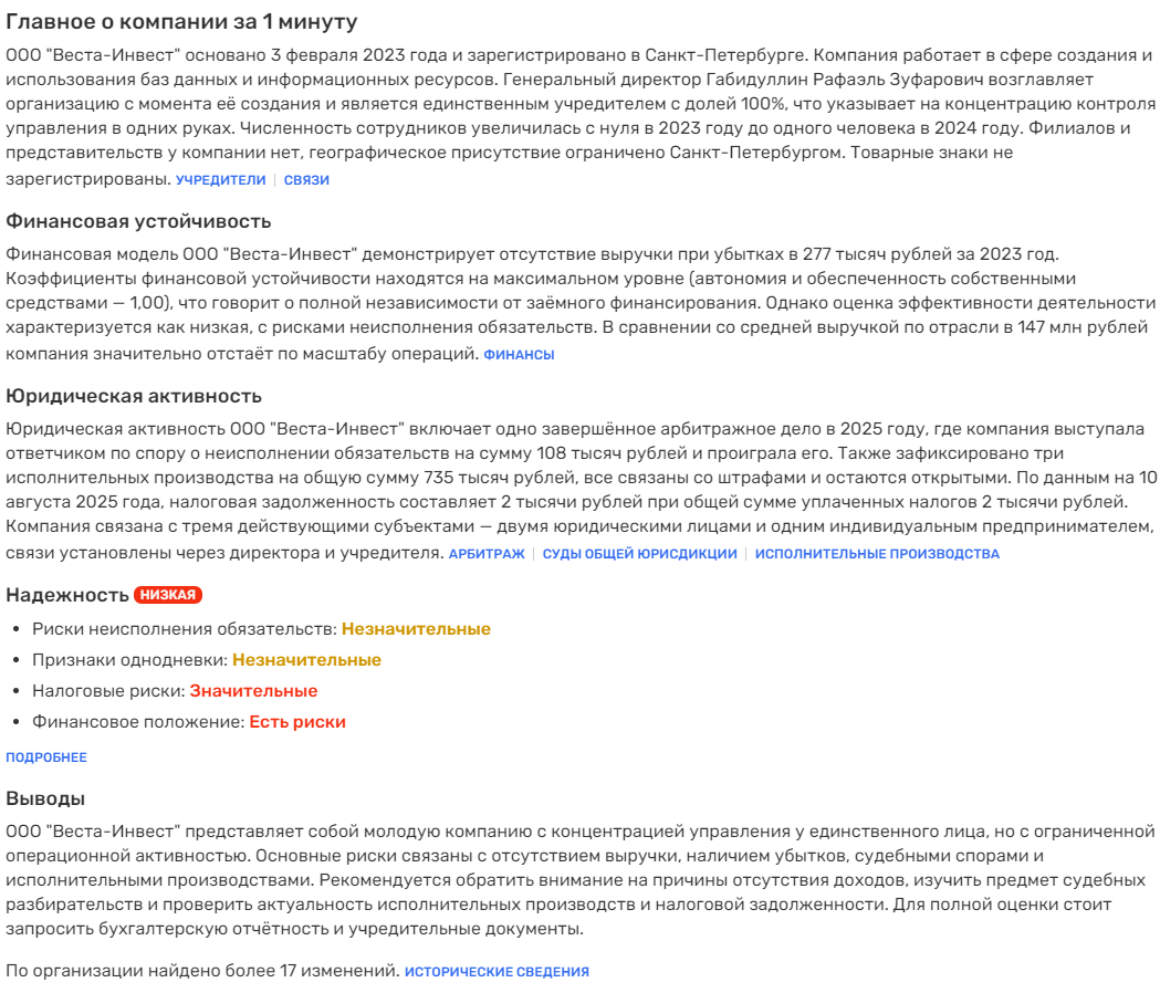 Фирма работает официально, но в перечне деятельности компании «Веста Инвест» не указано, что фирма может заниматься инвестиционной деятельностью. Также фирма за 2023 год демонстрировала убытки. За 2025 год уплачено налогов на 2 000 рублей, что показывает низкую деловую активность организации.