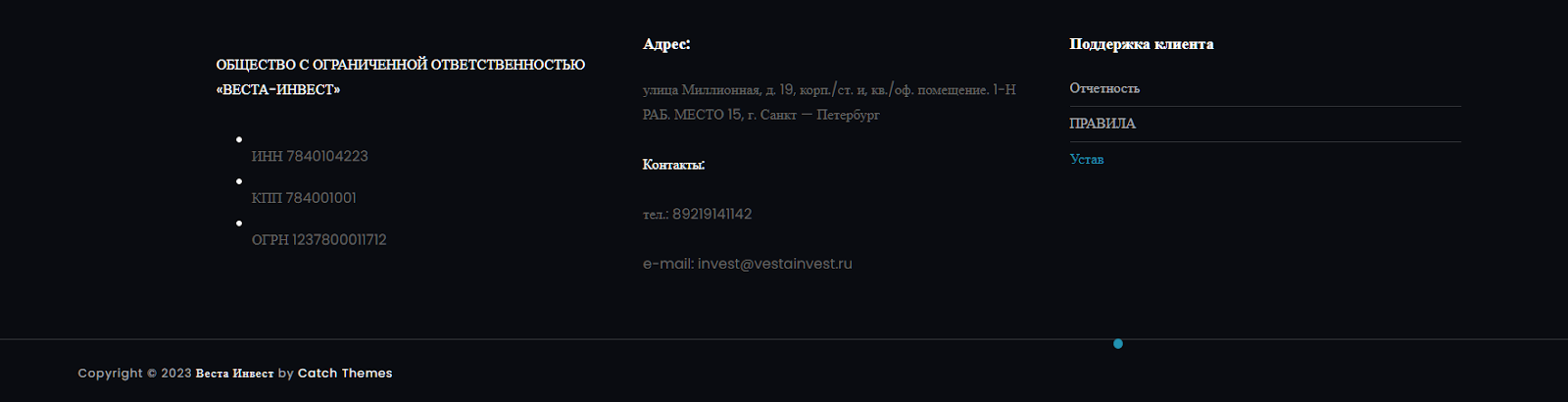 На сайте компании размещено только длинное пользовательское соглашение и отсканированный Устав организации. Также указан адрес электронной почты invest vestainvest ru, номер телефона и адрес офиса фирмы в Санкт-Петербурге.