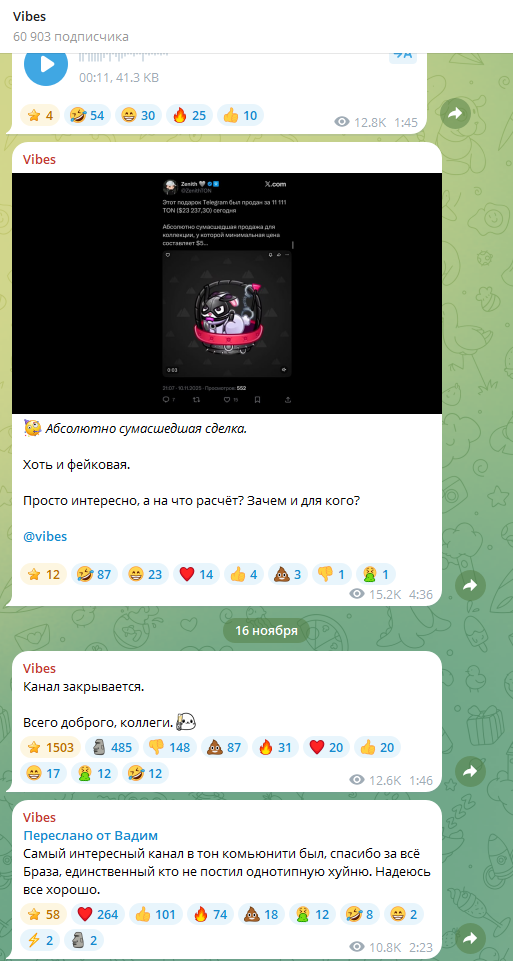 Канал Vibes – был не лучшим новостным ресурсом, где обсуждались новые функции Telegram, системы подарков и NFT. Реальных плюсов данный проект не имел. Минусы были следующие: