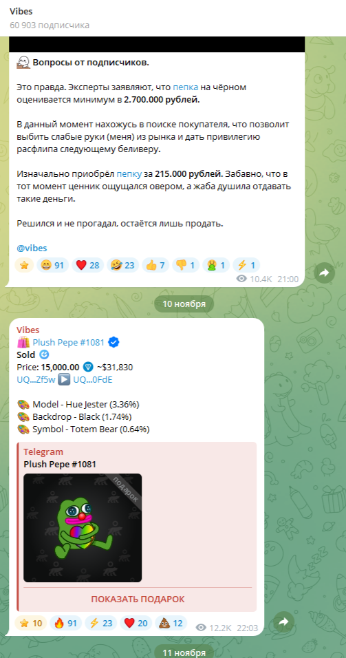 Мы не рекомендуем нашим читателям телеграм-каналы, подобные «Вайбес». Такие проекты часто вводят подписчиков в заблуждение. Хотите все знать о Telegram, системе подарков и NFT – выбирайте проверенные информационные платформы из наших экспертных обзоров.