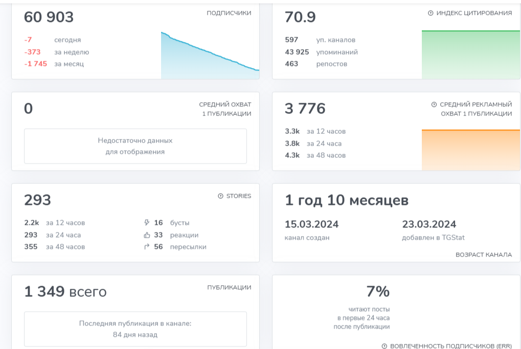 Проект обосновался в мессенджере 15 марта 2024 года. За время существования у канала было 70 000+ подписчиков. Всего 7% аудитории были интересны публикации автора. Данный факт говорил о явной накрутке ботами. На момент обзора количество подписчиков канала составляет 60 000+. Данная цифра вызывает закономерное удивление. Ведь 16 ноября 2025 года автор заявил о закрытии проекта, не указав причины подобного решения.