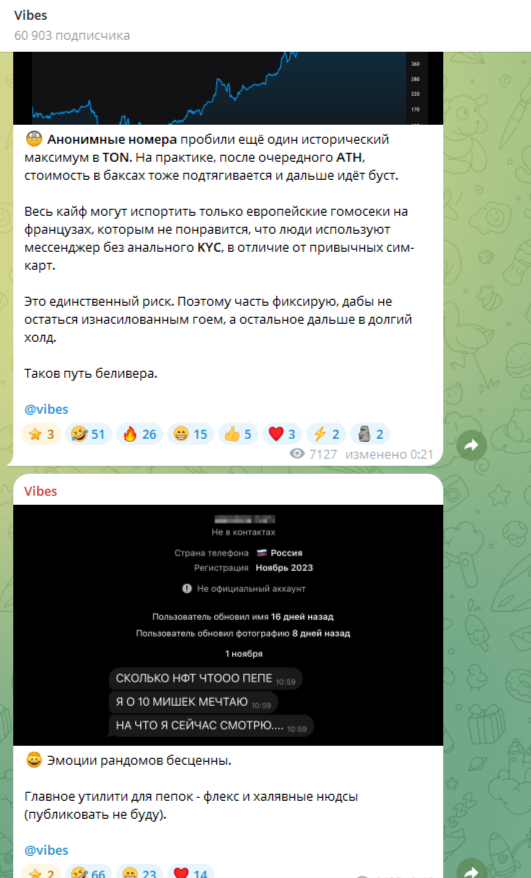 Основу контента канала в ТГ Vibes составляли обсуждения новых функций Telegram, системы подарков и NFT. Время от времени в ленте ресурса можно было обнаружить конкурсы с розыгрышами премиум-подписки, а также рекламу различных сомнительных проектов.