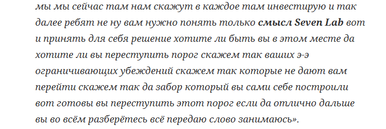 Виорика Русу не объясняет никаких условий сотрудничества, не дает точных цифр дохода, количества денег, инвестируемого в проект. Неизвестно, чем занимаются на площадке SevenLab и вообще, что представляет собой клуб. Девушка утверждает, что нужно просто понять этот проект и принять решение о вступлении в него.