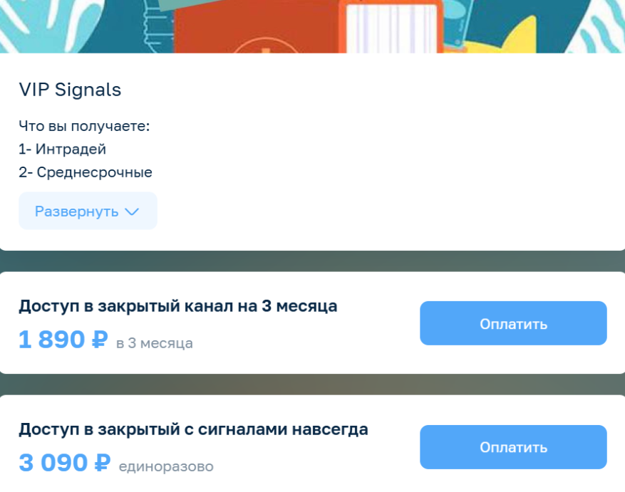 Помимо канала VIP Gold Investor, в Сети есть информация о существовании площадки VIP Signals с сигналами для заключения сделок на рынке. Клиентам обещают доступ к дневному и среднесрочному трейдингу в плюс. Стоимость трехмесячной подписки – ₽1,890, навсегда получить доступ к проекту можно за ₽3,090.