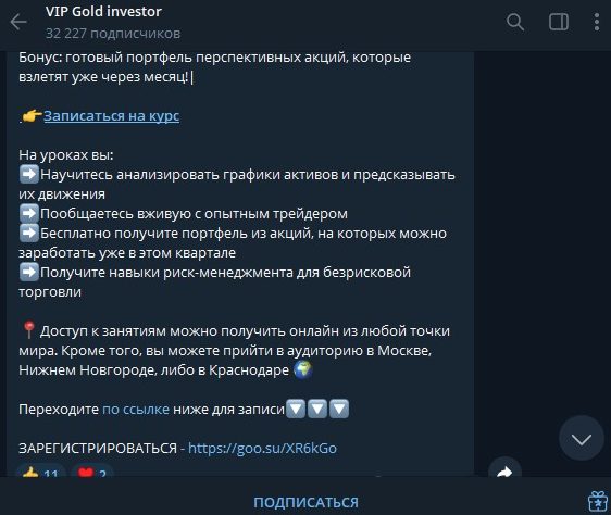 На одном из скриншотов видно, что на телеграмм-канал VIP Gold Investor было подписано 32 225 пользователей, что можно считать высоким показателем. При этом проверить признаки накрутки и степень вовлеченности пользователей невозможно.