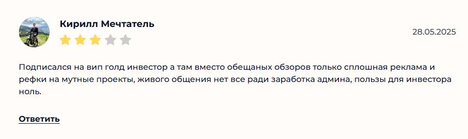 У юзера с никнеймом Кирилл Мечтатель также отрицательное отношение к трейдеру. Он говорит о постоянной рекламе непроверенных проектов, отсутствии живого общения.