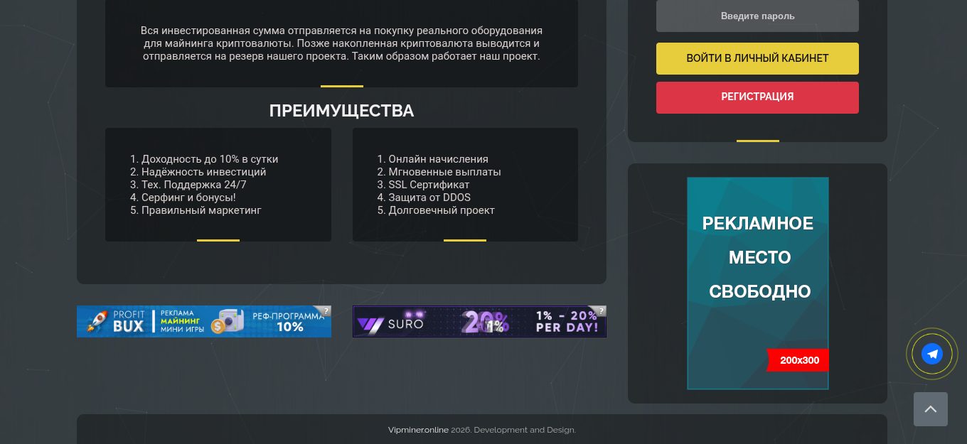 Далее в рамках дополнения к вышеупомянутому блоку менеджеры биржи отметили онлайн-начисления, наличие защищенности в виде SSL и монитора DDOS. К тому же, создатели платформы по инвестициям VipMiner online заявили о долговечности проекта. С этим мы поспорим, так как реальный запуск сервиса по заработку был 30.01.2026 года, поэтому бирже нет даже и месяца.