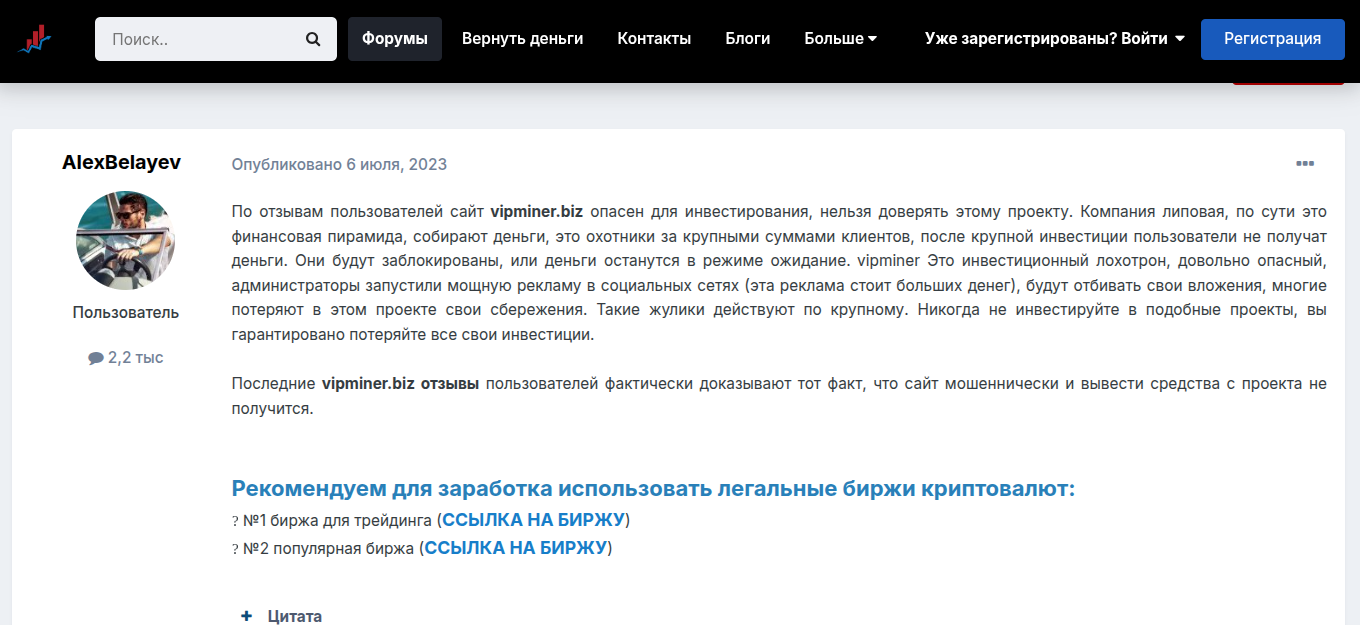 Про положительную репутацию можно забыть, потому что пользователи оставляют только негативные отзывы о бирже VipMiner online. Большая часть комментариев — жалобы на скам.