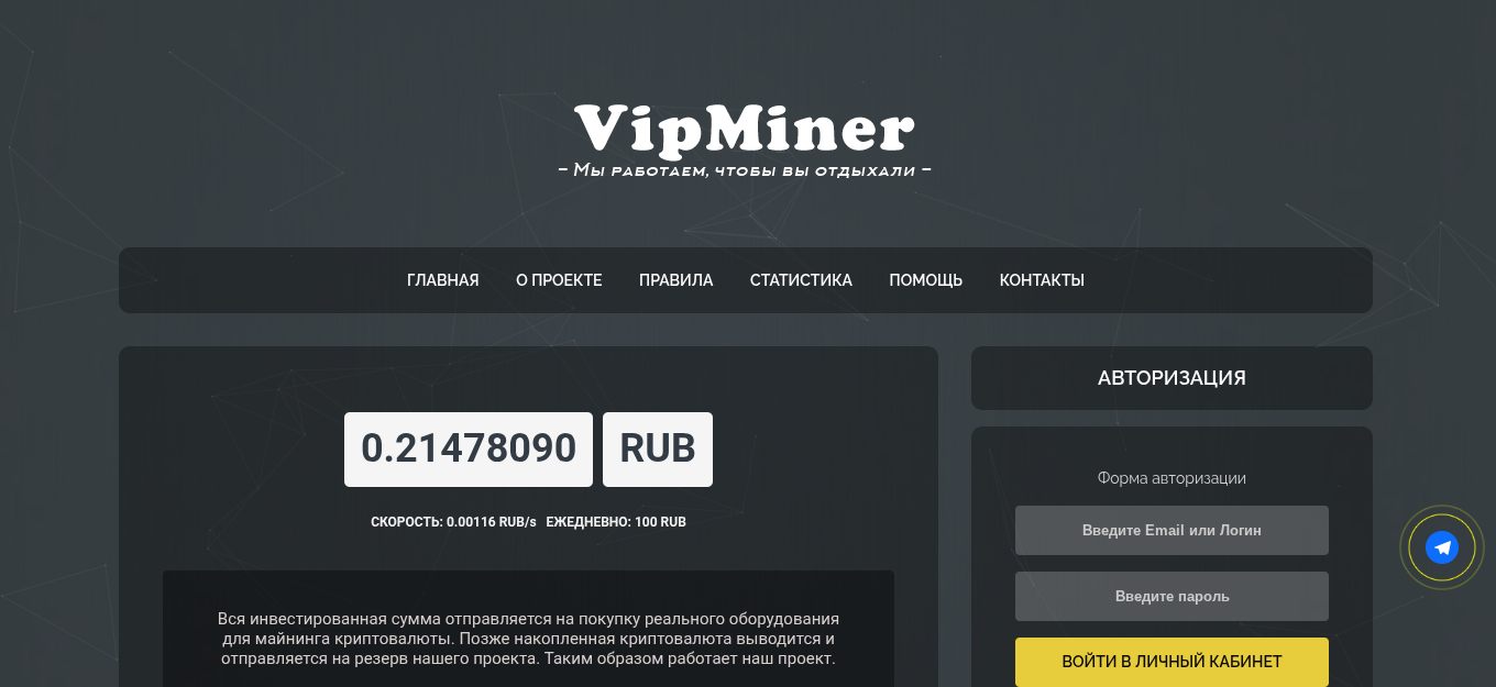 VipMinerOnline — финансовая платформа, где пользователям команда предлагает зарабатывать на так называемом майнинге криптовалют. Однако концепция несколько отличается от обычной добычи крипты. Как сообщают разработчики, все инвестиции от пользователей идут на закупку реального оборудования для майнинга криптовалют. Затем вкладчики получают долю от прибыли.