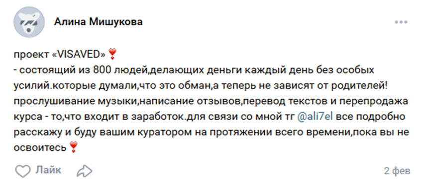 Чаще всего упоминания «Висавед» встречаются ВКонтакте. Сомнительные пользователи с закрытых профилей публикуют на стенах сообществ фрилансеров сообщения о том, какой это хороший проект и как много здесь можно зарабатывать. Причем напрягаться особо и не нужно.