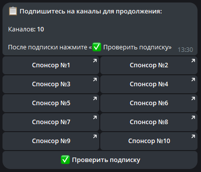 • Для запуска бота необходимо подписаться на 10 ресурсов спонсоров, многие из которых ведут на внешние площадки;