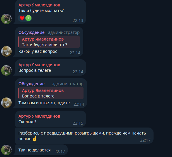 Поскольку телеграм канале Виталес Колес открыты комментарии, даже здесь можно встретить некоторые негативные сообщения, пусть и без утверждений о том, что кто-то мошенник. Так, например, пользователь может жаловаться на игнорирование в личных сообщениях, но не раскрывать деталей.