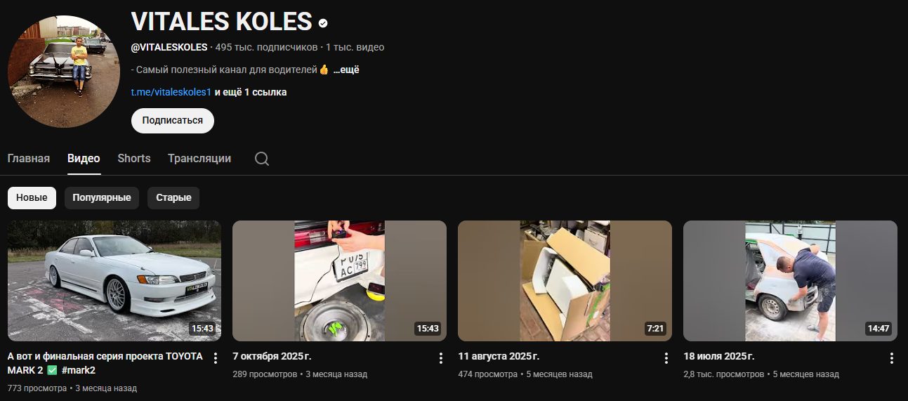 На ютуб-канал Vitales Koles подписано почти 500 тыс. пользователей, при этом роликов немного и они вообще не набирают просмотров. В этом можно было бы уследить накрутку, но данный аккаунт просто специализируется на Shorts. Немало коротких видео здесь набрали 10, 20 и даже 30 миллионов.