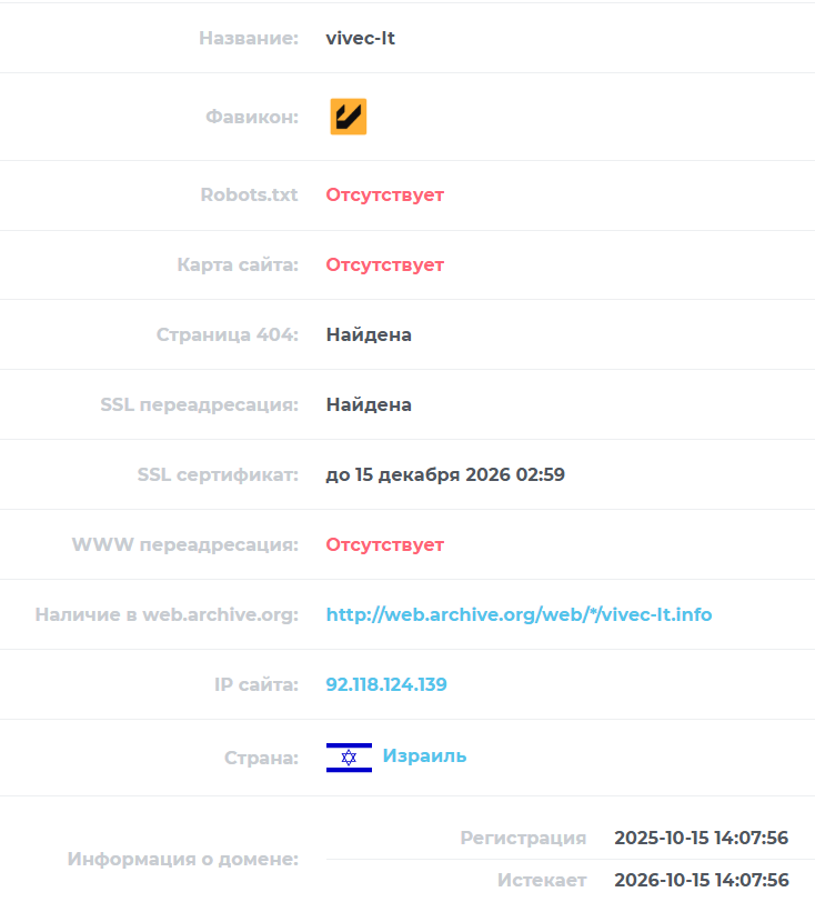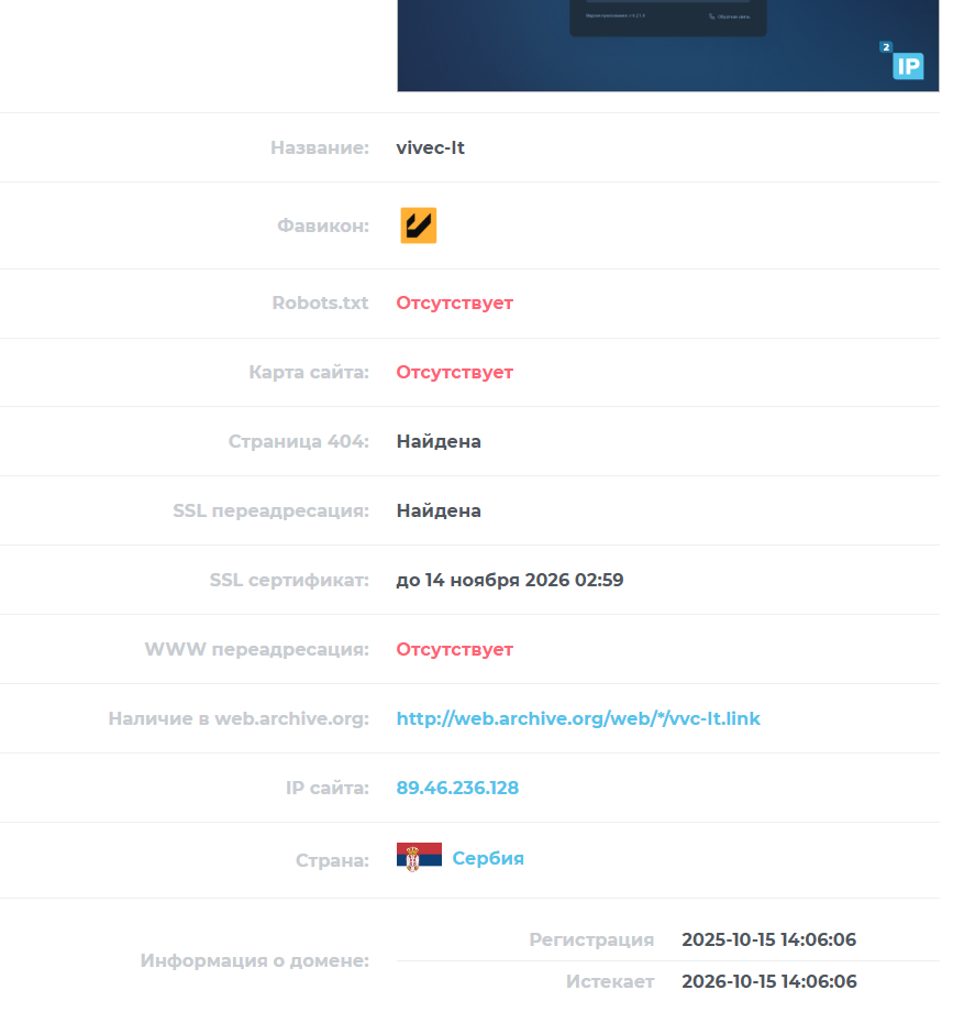 Домена у компании 3: Vivec lt info, Vvc lt link и Viveclt org. Первые 2 созданы в конце 2025, последний – в 2020. Но это расходится с легендой фирмы, которая якобы начала свое существование в 2017 году. Просто аферисты купили уже существующий адрес, чтобы вызвать к себе больше доверия.