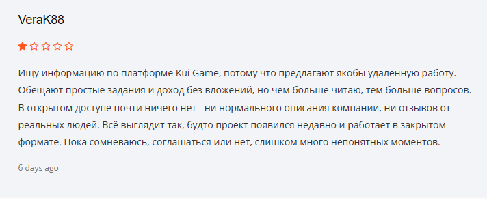 Наши предположения о том, что Https Kui Game World похож на развод, подтверждают отзывы пользователей на различных форумах. Они пишут, что компания позиционируется как место для заработка в интернете, но при этом никаких документов у организации нет.