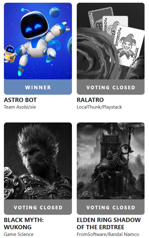 Само голосование уже является завершенным, а победу среди всех претендентов одержал Astro Bot. Вот только абсолютно все проекты отсюда, включая, например, Black Myth Wukong выходили не в 2025-м году, а в 2024-м.