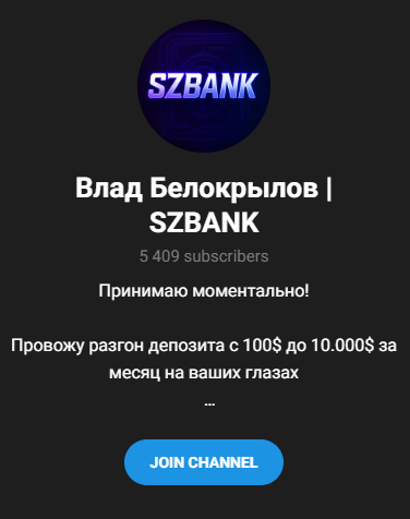 Мы познакомились с телеграмм-канлом «Влад Белокрылов | SZBANK», узнали об услугах по раскрутке счета, а также оценили риски при сотрудничестве с инвестором. По итогам обзора пришли к выводам: