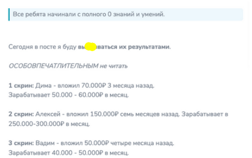 Инвестор занимается раскруткой депозитов, он предлагает подписчикам перевести ему деньги, на которые он будет торговать. В результате, Влад обещает перевести клиенту часть прибыли в качестве дивидендов, но не предлагает ни одной реальной гарантии.
