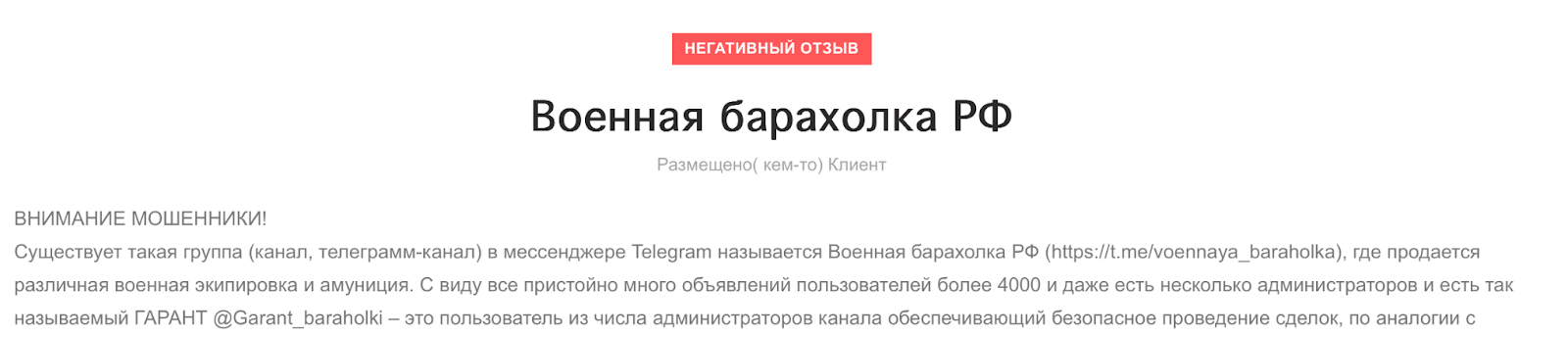 В отзывах о тг «Военная Барахолка РФ» есть и жалобы на прямую оплату продавцам, найденным через канал. Часть пользователей жалуется, что после предоплаты продавец просто исчезает.