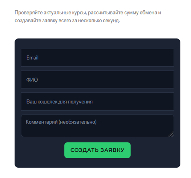 Далее клиент сразу переводится на страницу для внесения персональной информации. Это актуальный адрес email, кошелек получения, ФИО. Дополнительно есть строка для комментариев, но ее заполнение необязательное.