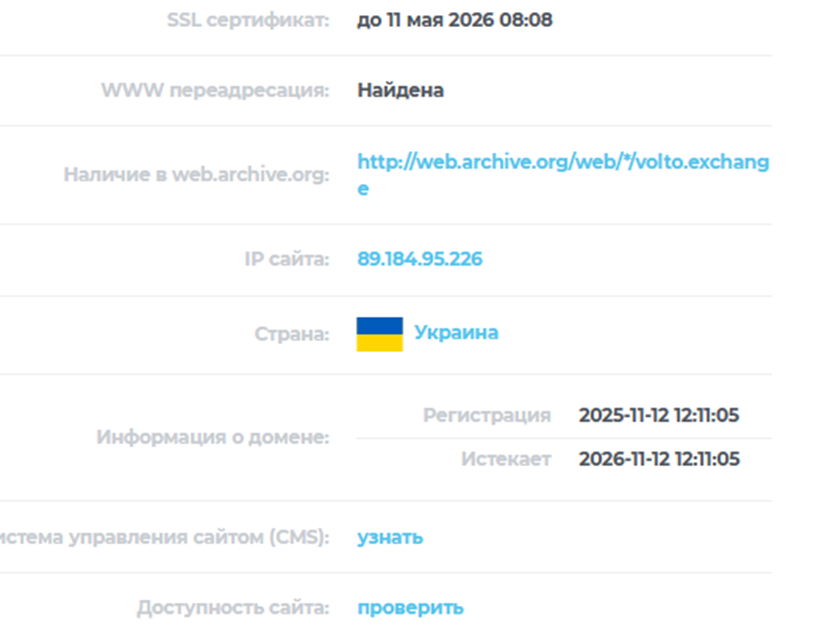 На сайте обменника Volto Exchange нет никакой информации о компании. Ничего не сказано о стране регистрации или наличии лицензии на деятельность. Но проверка домена показала, что он начал работу только в ноябре 2025 года. Сайт был зарегистрирован через украинский IP, срок действия истекает 12 ноября 2026. Активность на площадке низкая, архивные данные отсутствуют.