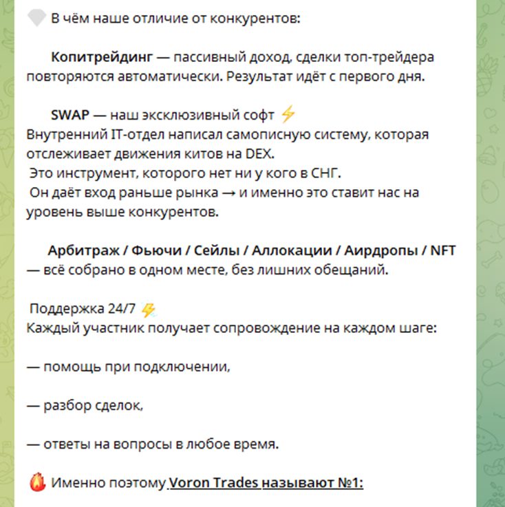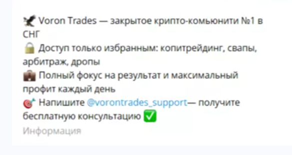 • Voron Trades bot – бот оказался в неактивном состоянии, судя по всему, ранее через него можно было получить бесплатные уроки и доступ в приватку;