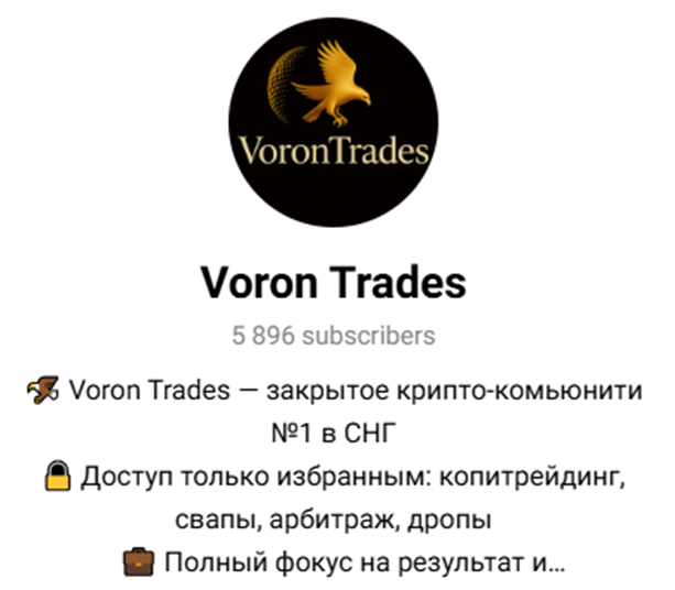• Voron Trades Переходник – канал, в котором один пост, видимо он создавался в качестве переходного чата к основному каналу, но ссылок на нем нет;