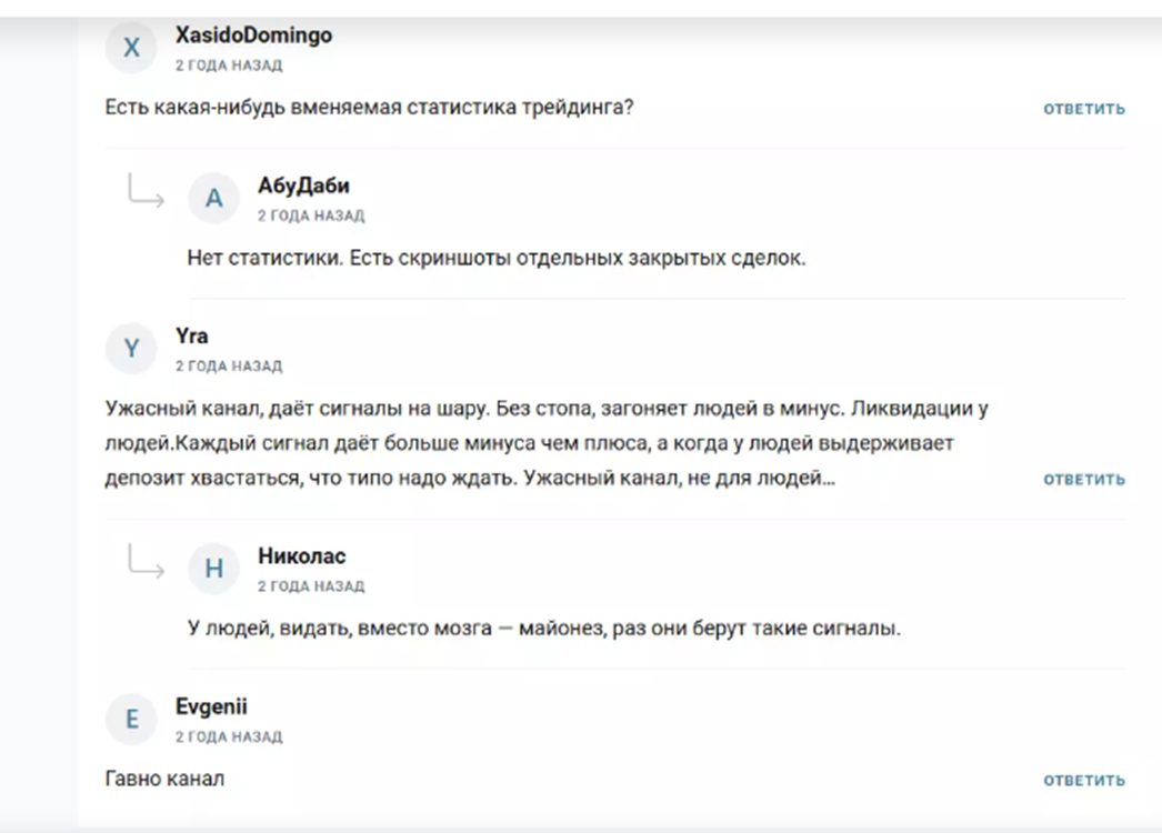 Все найденные в адрес проекта Voron crupto и его владельца комментарии негативные. Пользователи утверждают, что сигналы фейковые, статистики нет, да и сам трейдер банальный мошенник.