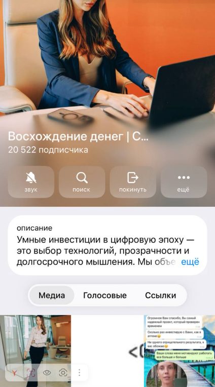 Восхождение Денег Секреты Успеха выглядит как типичный канал с раскруткой счета. Подобрали фотографию девушки на аватарку, генерируют весь контент с ней. Создатели накрутили 20 000 пользователей, из которых только 3% проявляются реальную активность.