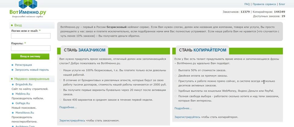 «Вот Именно» – нейминг-платформа, на которой заказчики приобретают оригинальные названия, уникальные доменные имена и яркие слоганы для бизнеса. А исполнители могут зарабатывать на выполнении заданий. Площадка ведет свою деятельность с 2008 года. Можно ли на ней зарабатывать, разберемся в ходе проверки.