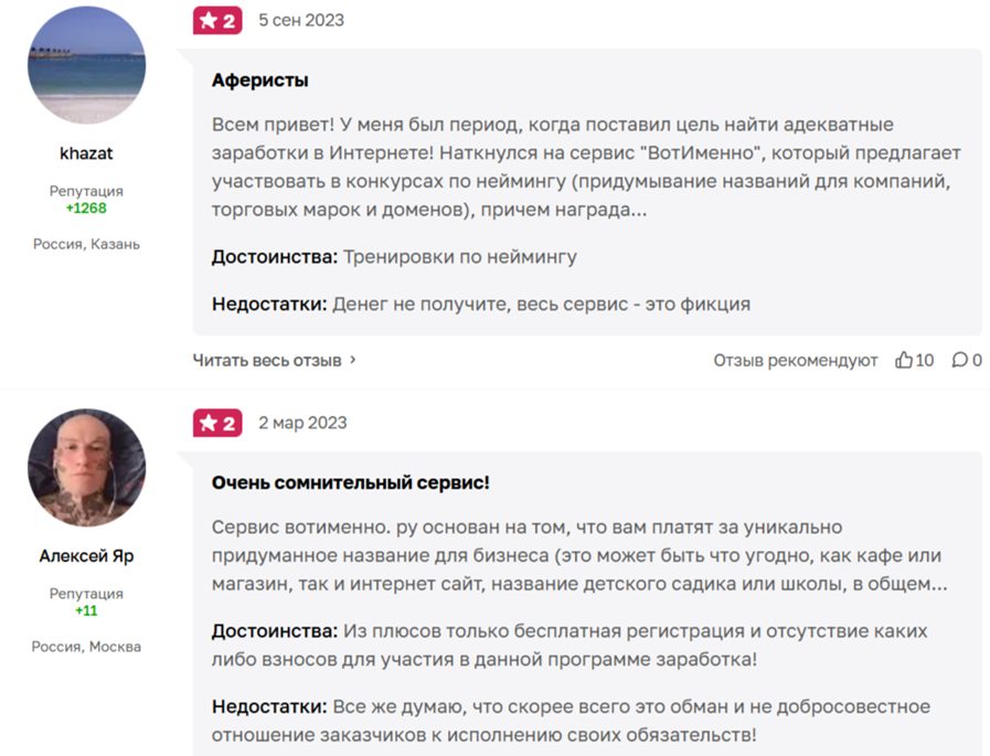 Отзывы о «Вот Именно Ру» в основном отрицательные. Пользователи жалуются, что многие заказчики не выполняют взятые обязательства, а выплаты задерживаются. Сервис называют сомнительным, так как его администрация не берет на себя ответственность за работу сайта. Еще пользователи пишут, что с площадки нельзя перевести деньги, так как эта опция заблокирована.