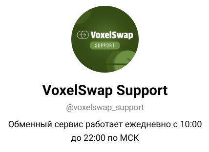 Для связи с поддержкой также существует канал в Телеграмм «ВоксельСвап Саппорт». Там можно написать менеджерам проекта, а в описании говорится, что сервис работает с 10 до 22 по Москве.