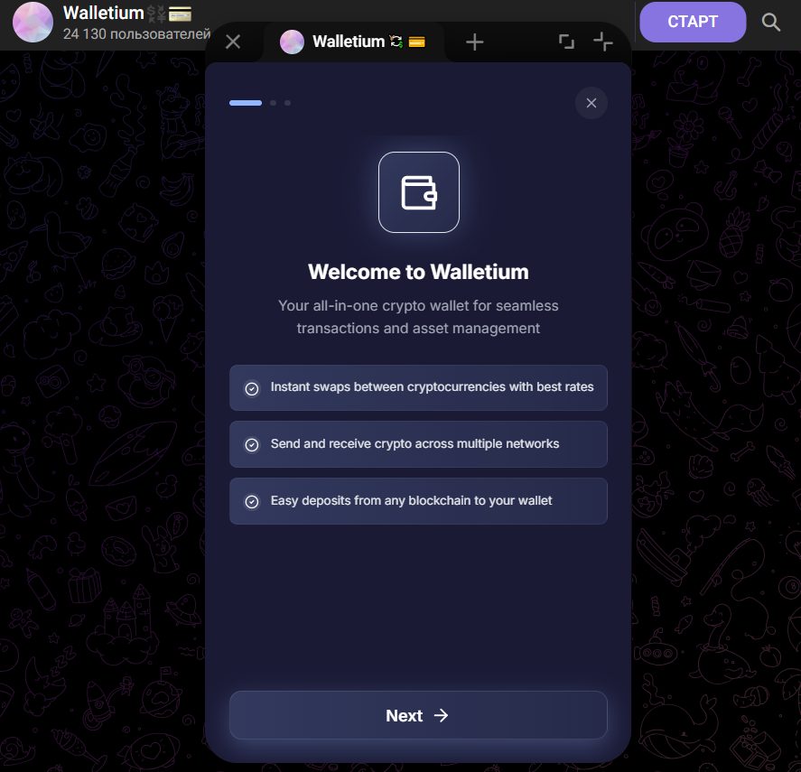 Кроме базового хранения и выгодных переводов, Walletium подчеркивает интеграцию с Telegram как основное преимущество. Пользователь не скачивает отдельное приложение, весь функционал доступен прямо в боте. Клиенты сервиса могут быстро подключать кошелек, проводить свопы между цепочками без мостов и отслеживать портфель в реальном времени. На март 2026 года сервис также ввел собственный утилитарный токен TEX, который используется для оплаты комиссий внутри экосистемы и начисления вознаграждений.