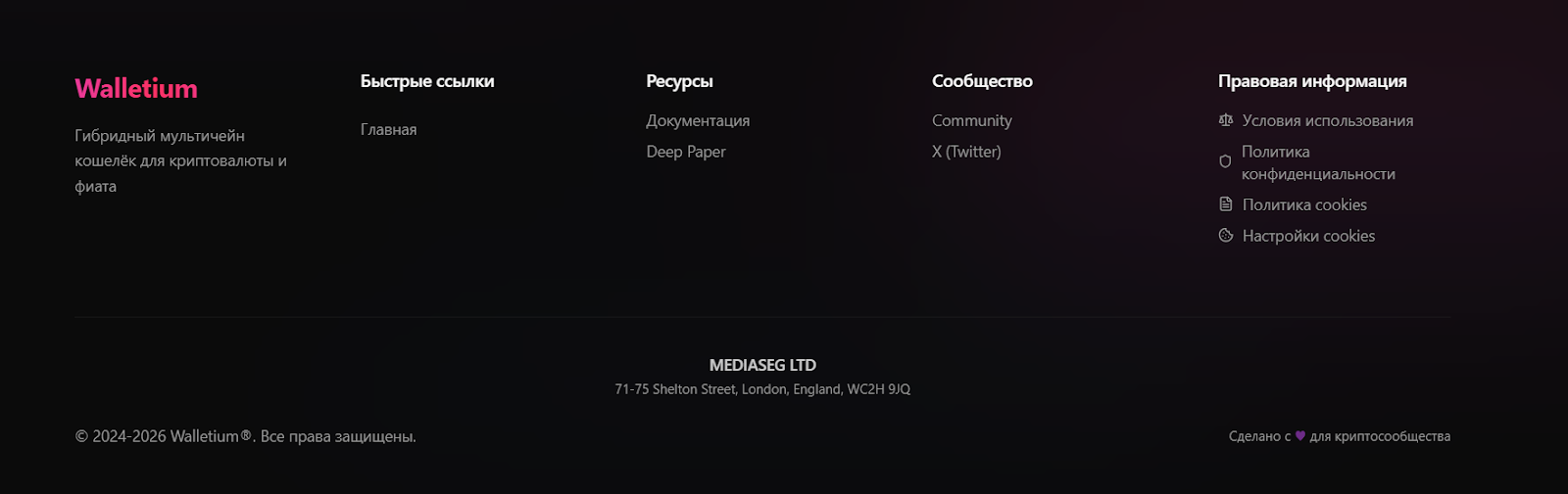 Владельца и компанию Walletium Wallet не раскрывают вообще. В открытом доступе нет раздела «О нас», конкретных имен или адресов, ООО, лицензий или регулятора. Только общие вроде «корпоративная инфраструктура», «собственный блокчейн-процессор» и пр.