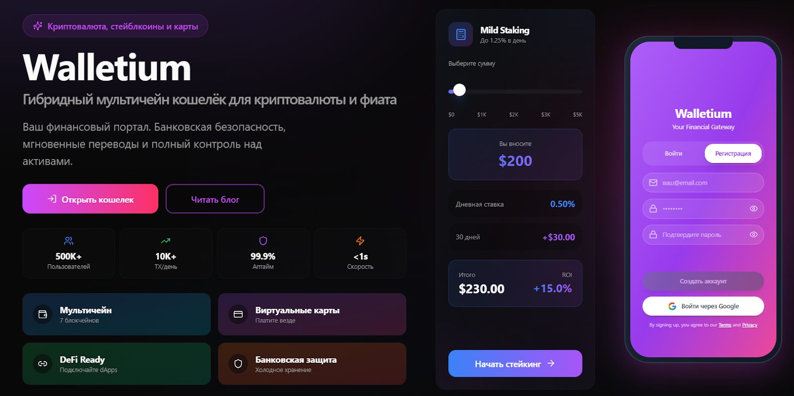 «Валлетиум» поддерживает семь блокчейнов, включая BTC, ETH, BNB и пр. Организация также выпускает виртуальные карты и проводит DeFi-подключение. Клиентам обещают мгновенные переводы и специальные подарки.