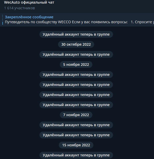 Так, например, выглядит чат связанной с компанией социальной автомобильной программы WecAuto. Никаких новых сообщений с 2022 года: