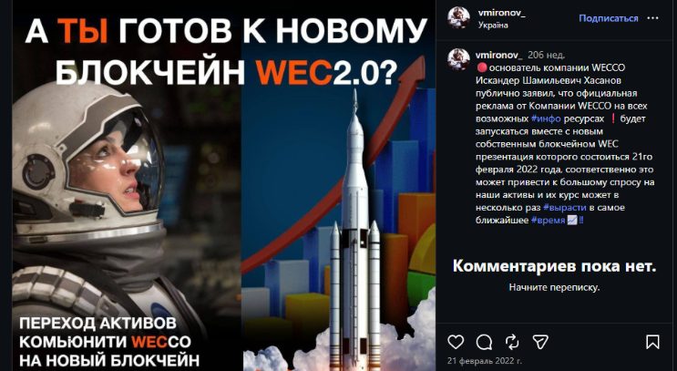 - Почти все операции внутри организации связаны с коином WEC, но он, похоже, фиктивный, т.к. нигде не торгуется;