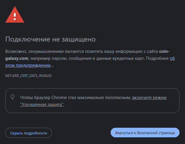 При переходе по сайтам других упомянутых ресурсов нас встречает либо ошибка, либо предупреждение об опасности от браузера.