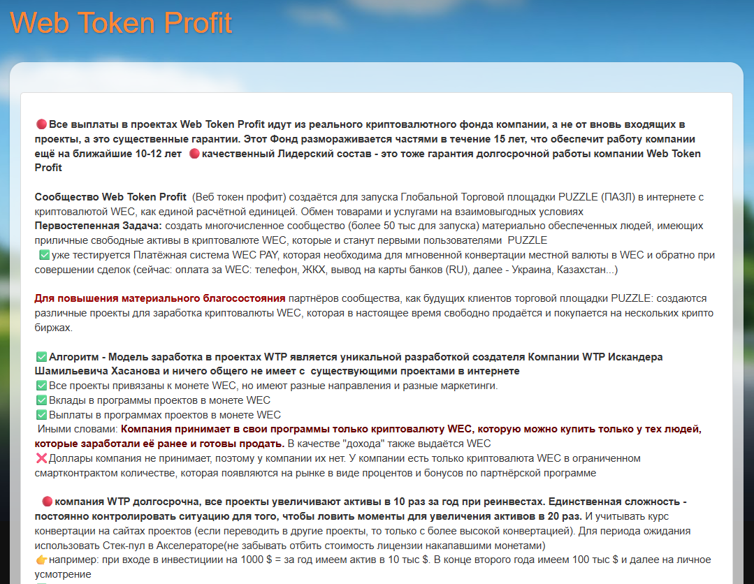 Web Token Profit — это инвестиционная компания, запущенная неким Хасановым Искандером Шамильевичем. Организация якобы предлагает уникальную модель заработка, привязанную к монете WEC. Разработчики утверждают, что благодаря разработанной ими системе ресурс увеличивает активы в 10 раз за год при реинвестировании. Клиенты же, как заявляют представители конторы, могут рассчитывать на прибыль намного больше, чем от депозита в банке.