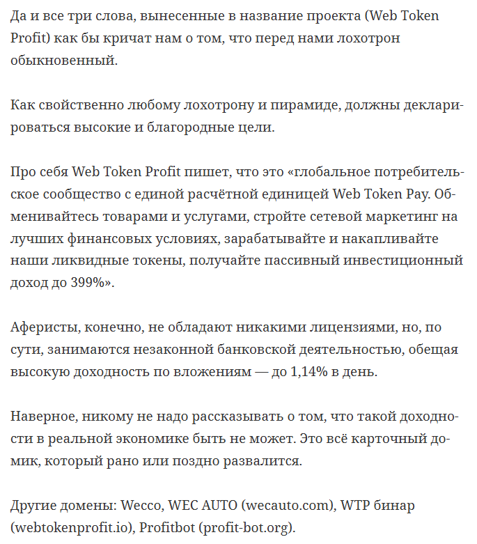 На сегодняшний день найти актуальную группу или сайт WebTokenProfit оказалось невозможным, однако в сети есть большая статья от создателей ресурса с описанием всех основных моментов. Уже в первом абзаце автор утверждает, что работа компании обеспечена как минимум на 10–12 лет вперед за счет криптовалютного фонда. Судя по отсутствию официальных площадок в интернете, обещания основатели не сдержали.