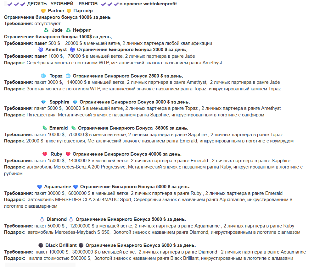 - 10-ранговый карьерный рост среди клиентов. По достижении нового уровня компания выдает подарки: например, значки с логотипом фирмы и сапфирами, дорогие автомобили и даже виллы. Подобные обещания от настолько подозрительного проекта звучат совершенно неубедительно.