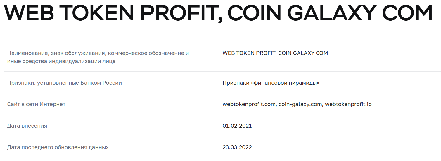 - ЦБ России признал WebToken Profit финансовой пирамидой;