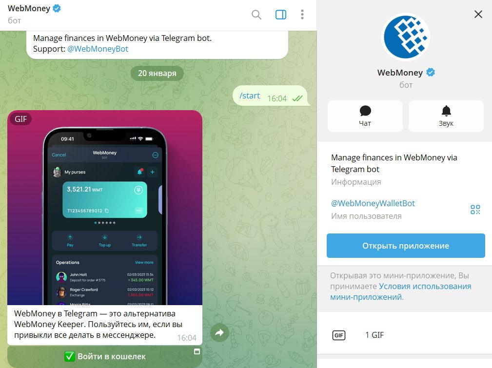 Помимо прочего, у «ВебМоней» работает также бот в Телеграм WebMoneyWalletBot. Он позволяет осуществлять вход в свой кошелек системы прямо внутри мессенджера и совершать любые операции.